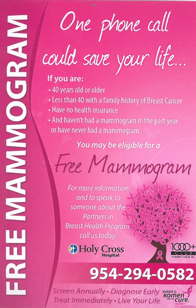 PIBH provides outreach education, clinical breast exams, screening mammograms and diagnostic procedures to uninsured, lower income and minority individuals, age 40 year and who are Broward County residents.